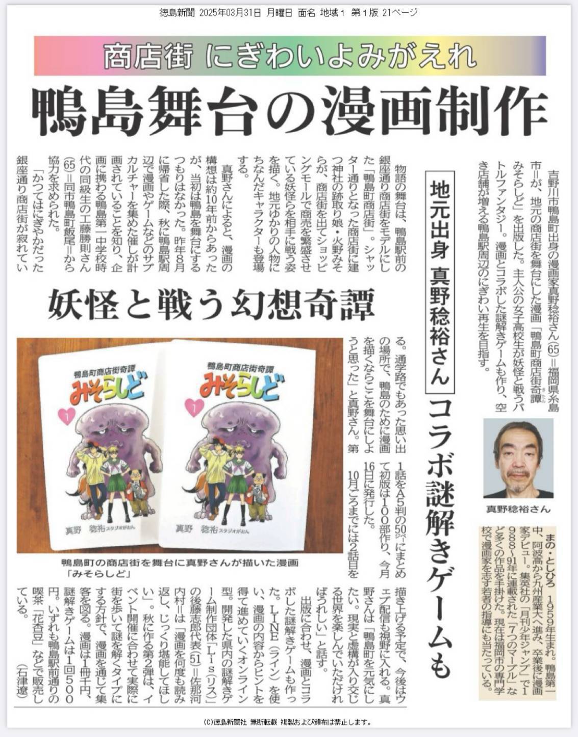 昨年度末には徳島新聞では「商店街にぎわいよみがえれ・鴨島舞台の漫画製作」として紹介され、大きな注目を集めました。